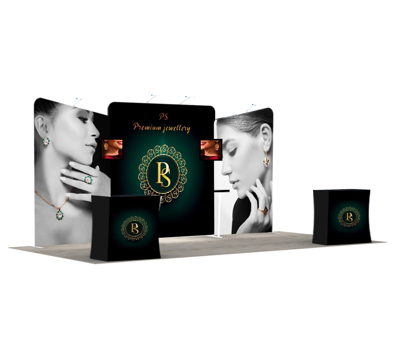 Personalise to Suit Your Brand Identity: The 20ft trade show booth can be personalised with the artwork of your choice. Each background is printed using the latest dye-sublimation technology giving it a vivid finish.