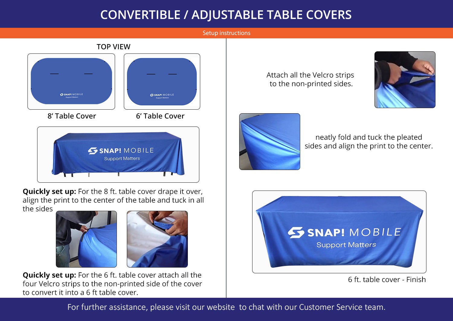 Our event table covers are available in a variety of popular sizes, perfect for any event, and come in several background colours to complement your theme. Personalisation is straightforward with our adjustable covers. Design online, upload your artwork, or collaborate with our professional designers to vividly bring to life your table covers with logo or tagline. The robust self-securing closure fasteners ensure secure, easy adjustments for a flawless fit in any environment. Additionally, each cover is offered with the option of a convenient carry bag and table cover clips for even simpler setup and transportation.