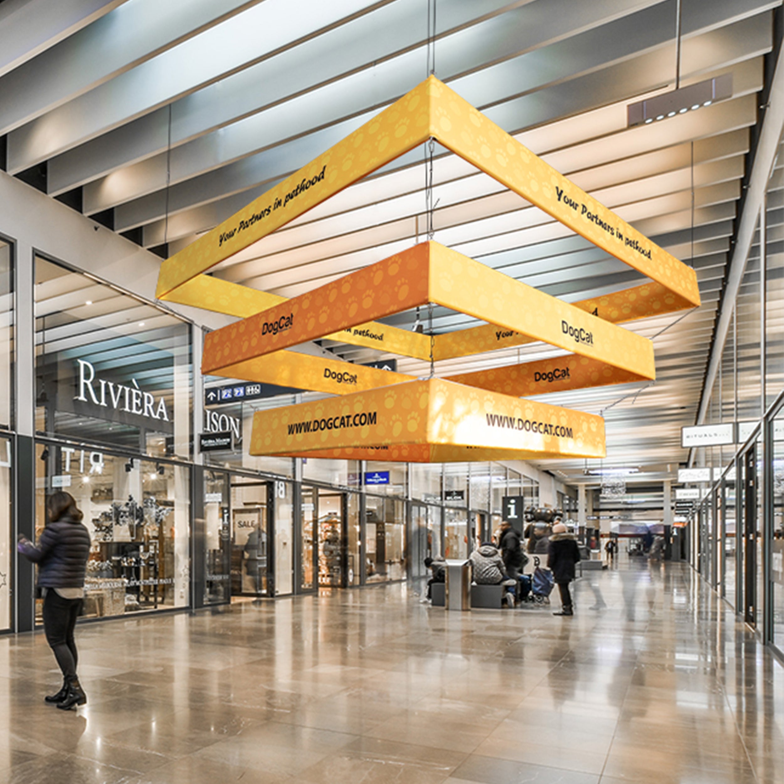Maximise your ceiling space with the Tiered Square Hanging Sign, featuring three graduated square frames hanging at different heights. Made from lightweight aluminium and premium tension fabric, it offers up to 192 sq ft of double-sided graphics for trade shows, retail spaces, and large events. The modular design simplifies ceiling installation while creating a compelling visual hierarchy that naturally draws attention upwards.